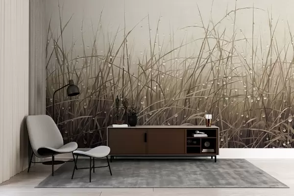 Stenske poslikave Trava s kapljicami vode, utišani rjavi odtenki, mehka svetloba, megleno ozadje, abstraktni minimalistični teksturirani slog Št. w09217v1