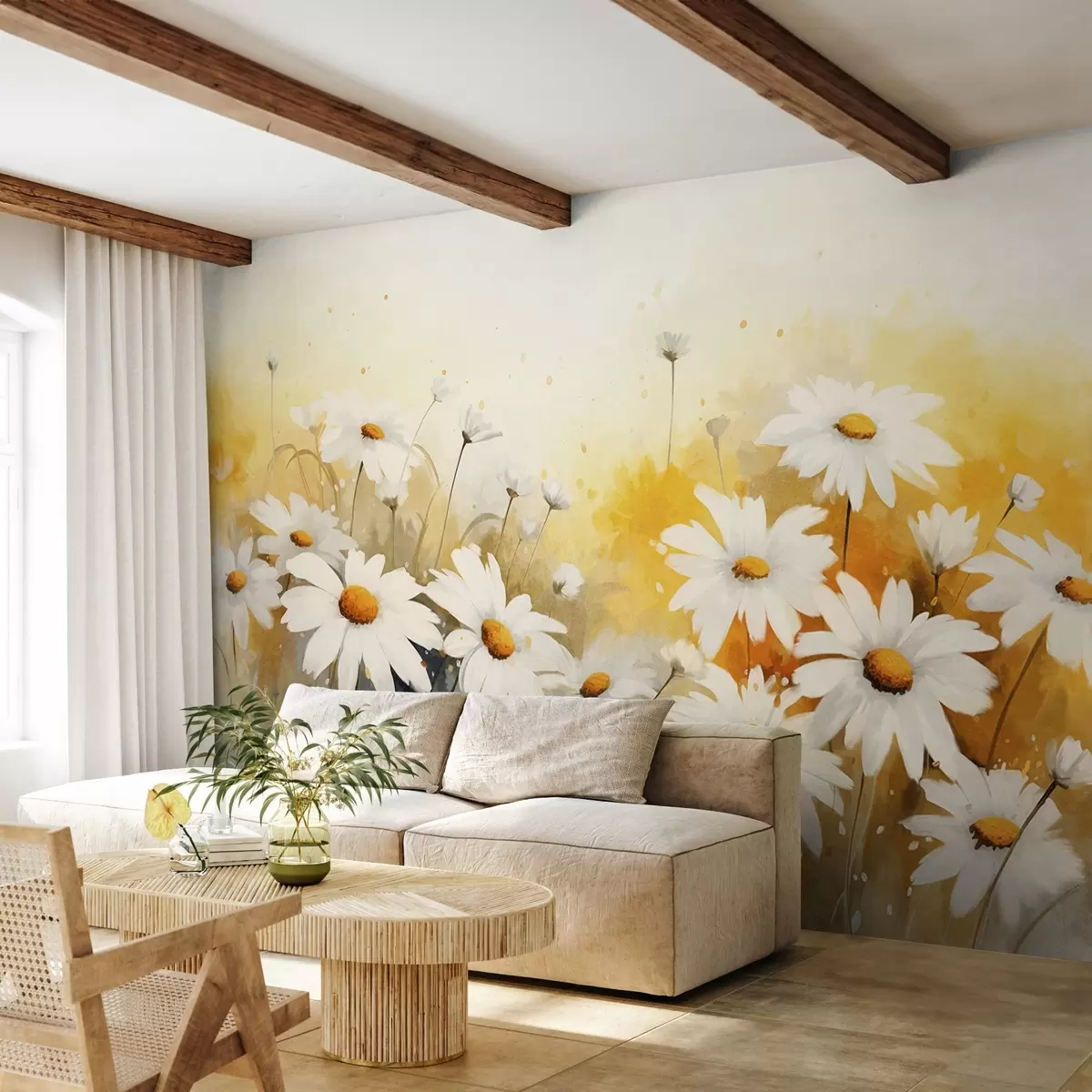 Stenske poslikave Polje belih marjetic z rumenimi središči na mehkem rumenem in bež ozadju, v akvarelnem slogu Št. w09218