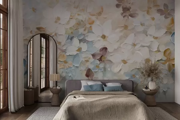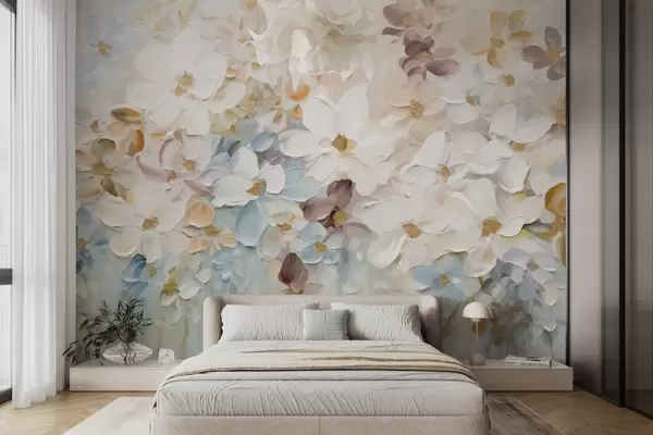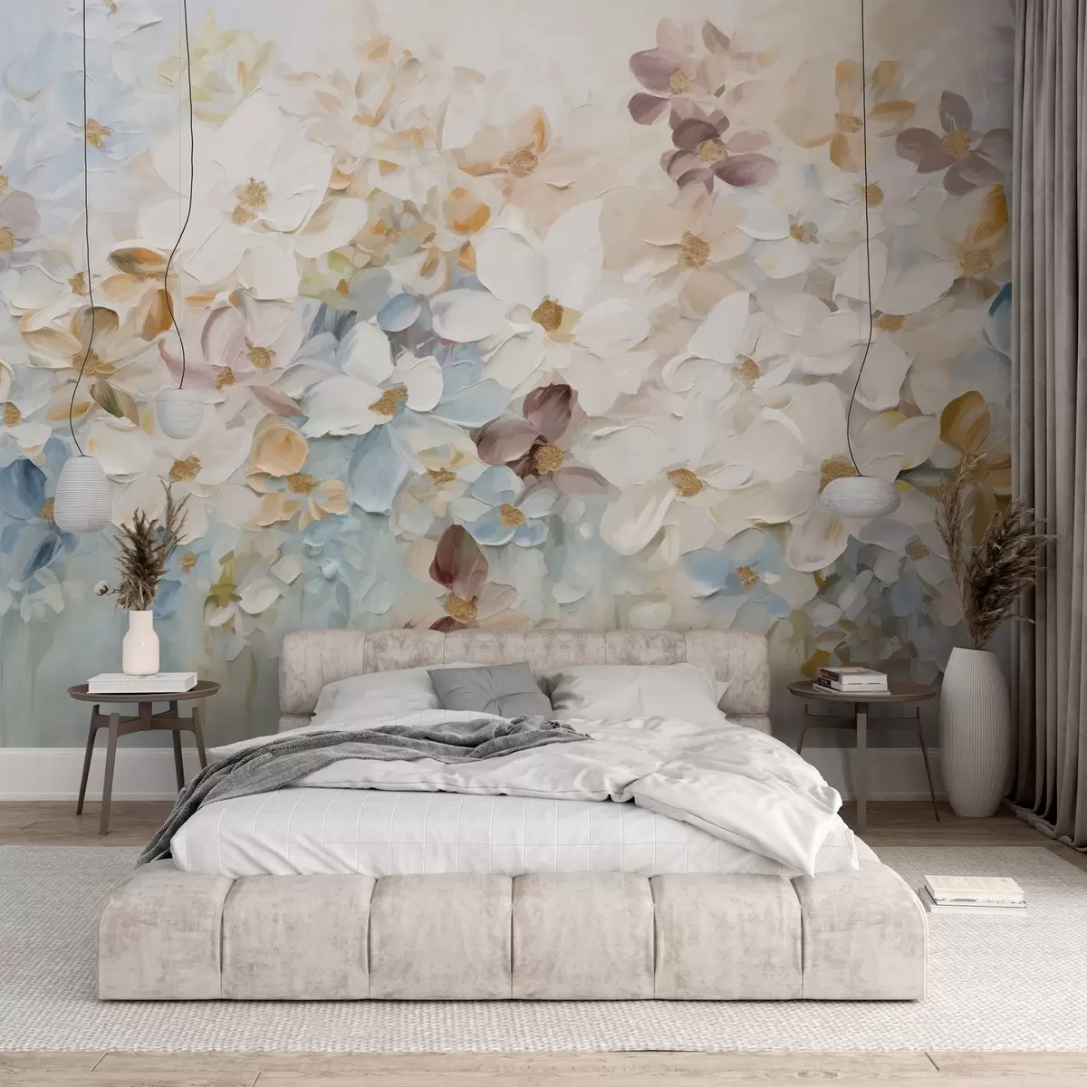 Stenske poslikave Oljna slika, imitacija cvetličnega vrta z belimi, modrimi in oranžnimi cvetovi, mehkimi potezami čopiča, pastelnimi umirjenimi barvami Št. w09236v1
