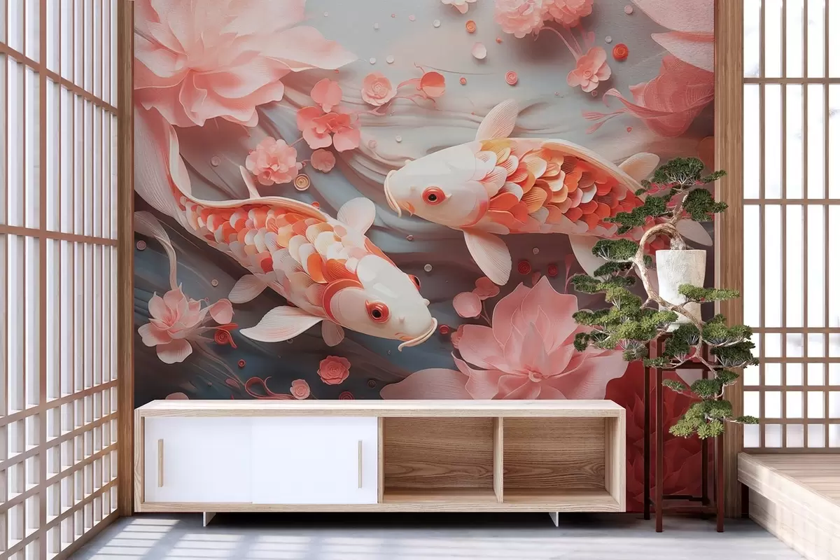 Stenske poslikave Nežne ribe z dimenzionalnimi luskami plavajo v toku cvetnih listov in nežnih rožnatih tonov Št. w09237