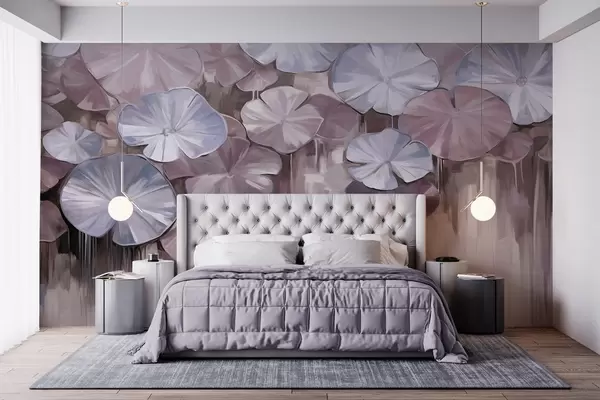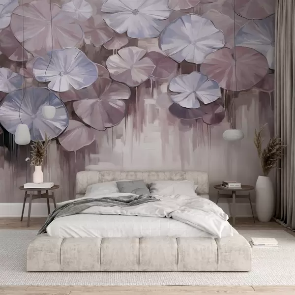 Stenske poslikave Teksturirane lilije z vijoličnimi in modrimi barvami v ribniku, ozadje je zamegljena mešanica mehkih odtenkov vijolične barve Št. w09255v1