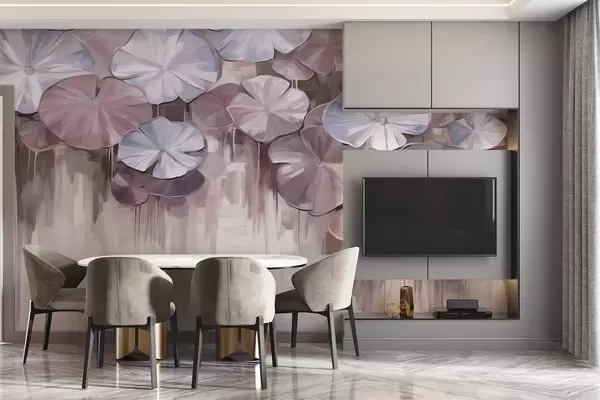 Stenske poslikave Teksturirane lilije z vijoličnimi in modrimi barvami v ribniku, ozadje je zamegljena mešanica mehkih odtenkov vijolične barve Št. w09255v1