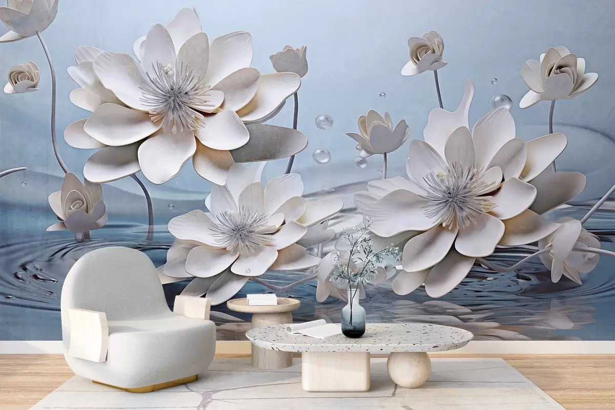 Stenske poslikave Bele teksturirane rože s kapljicami vode, odsevi na vodni površini, svetlo modro ozadje, elegantno oblikovanje Št. w09262