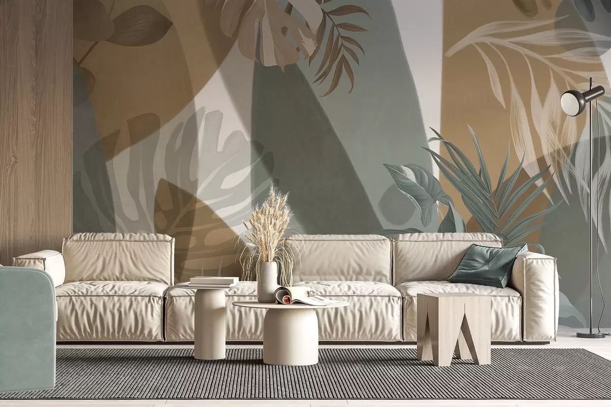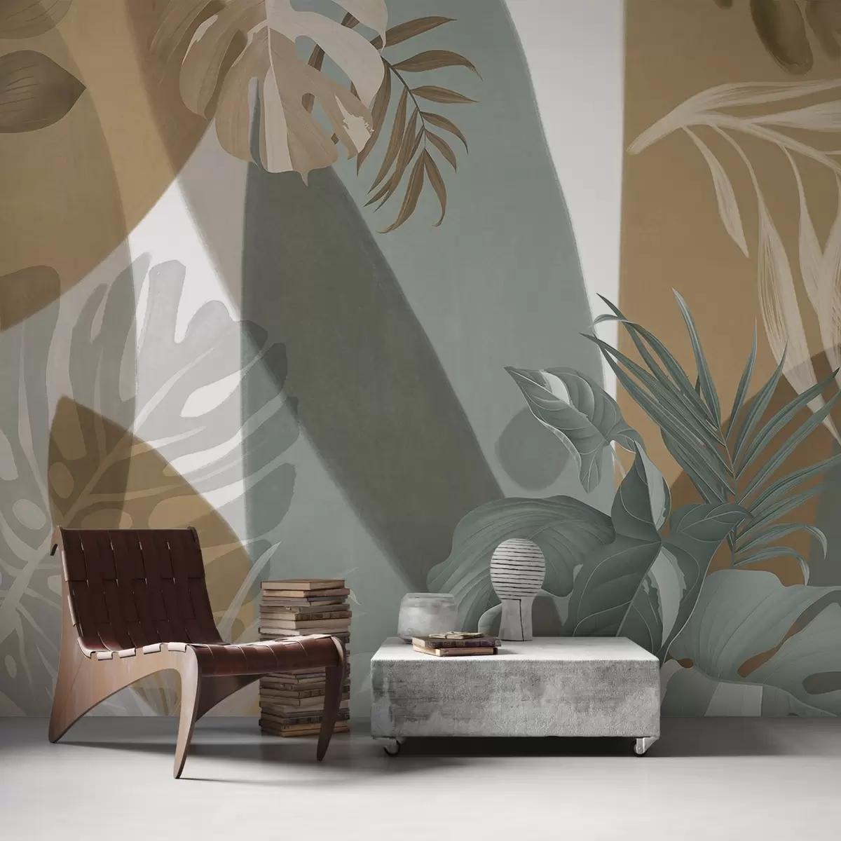 Stenske poslikave Listi monstere in palmovi listi v vzorcu z rjavo, belo in zeleno barvo, tropsko vzdušje, abstraktne oblike, dekorativno Št. w09288
