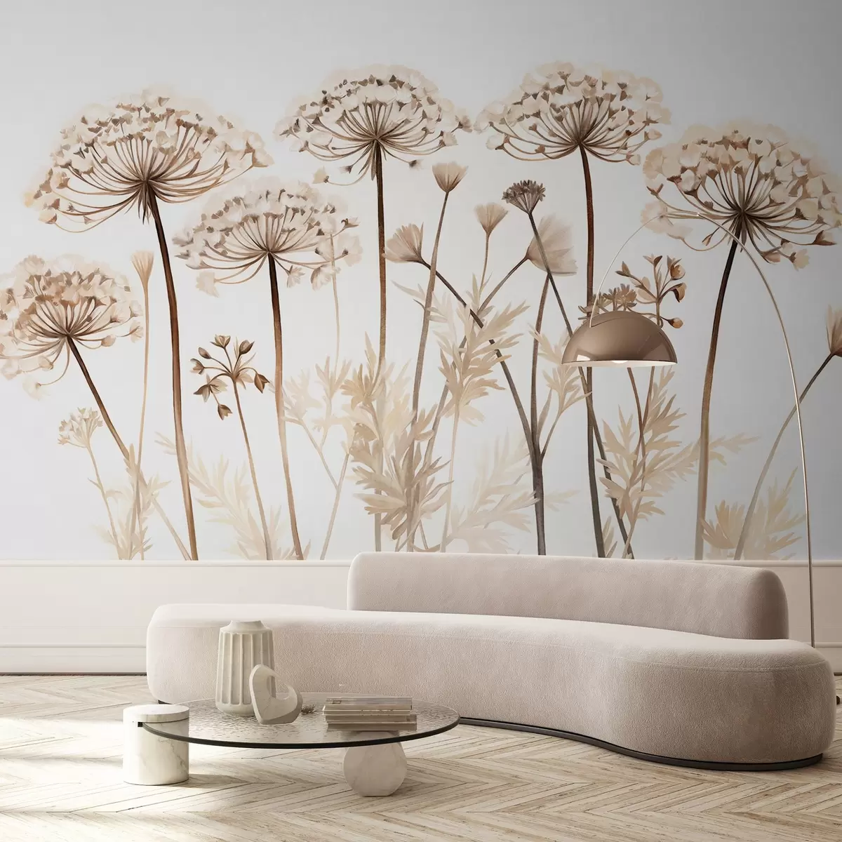 Stenske poslikave Čipka kraljice Ane cvetovi na polju, teksturirana imitacija slike, rjava, bež in bela barvna paleta, botanična ilustracija Št. w09294