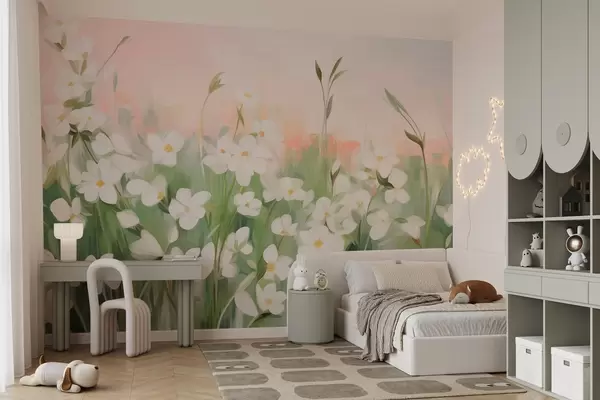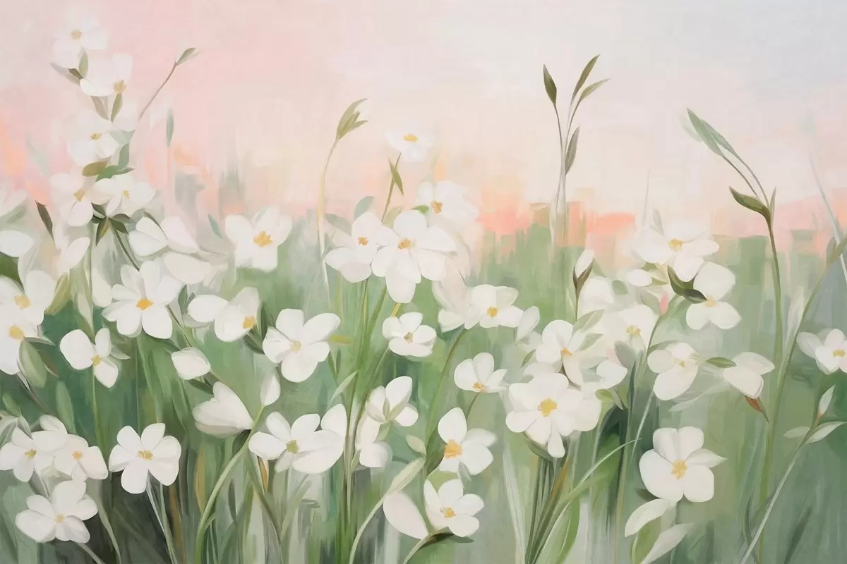 Stenske poslikave Abstraktno polje divjih rož z zelenimi stebli in listi, na ozadju nežno rožnatega in belega teksturiranega neba. Št. w09297