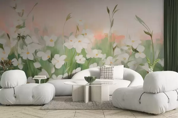 Stenske poslikave Abstraktno polje divjih rož z zelenimi stebli in listi, na ozadju nežno rožnatega in belega teksturiranega neba. Št. w09297
