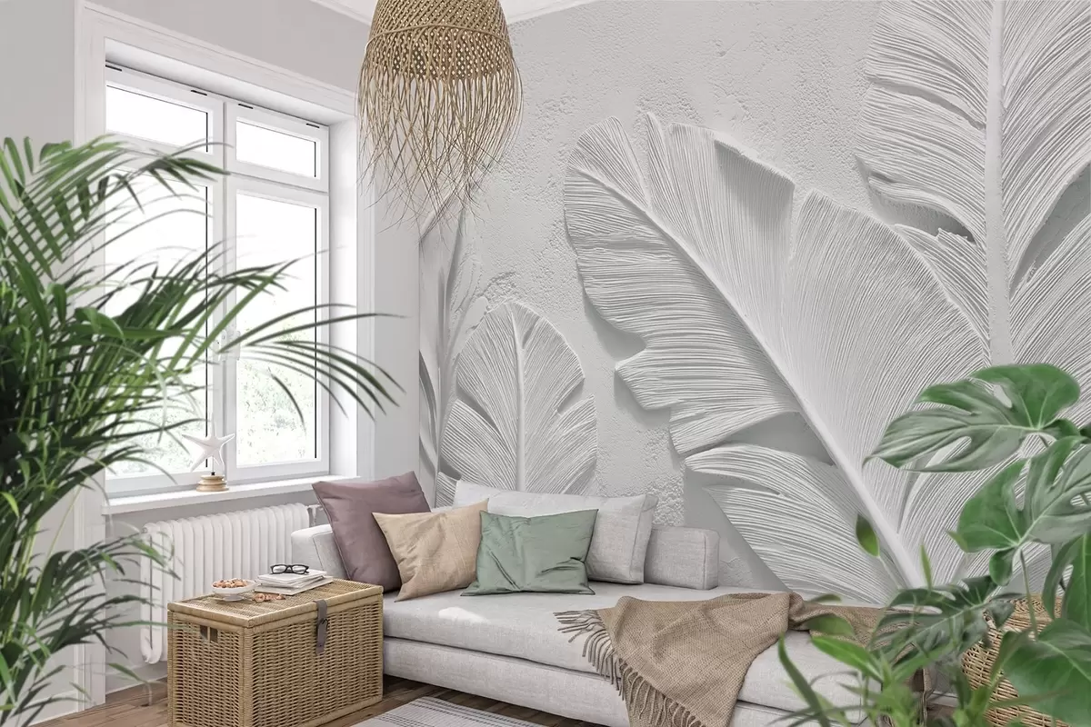 Stenske poslikave Teksturirani sivi listi na ozadju z reliefom iz umetnega ometa Št. w09307