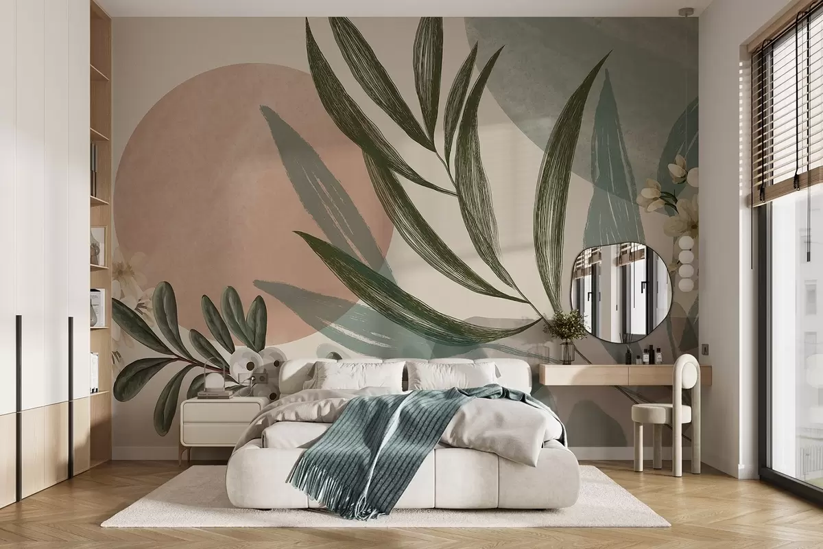 Stenske poslikave Abstraktna botanična umetnost z zelenimi palmovimi listi in belimi jagodami na ozadju oblik v umirjenih zemeljskih tonih Št. w09312