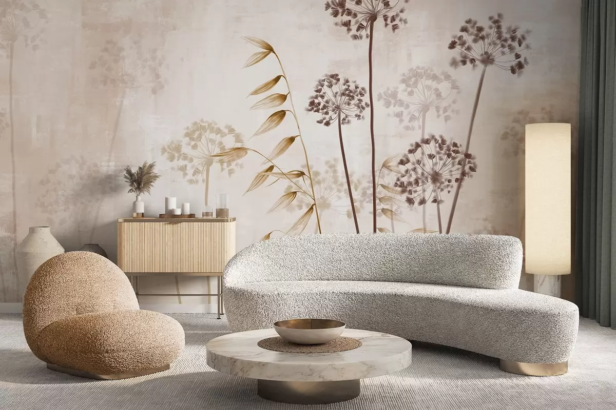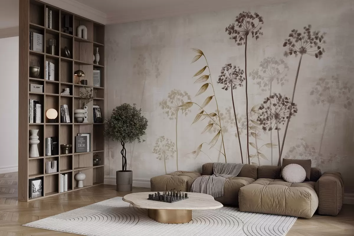 Stenske poslikave Risba posušenih cvetov z dolgimi stebli, enobarvna paleta, na teksturiranem, svetlo bež ozadju, botanična ilustracija Št. w09314v1