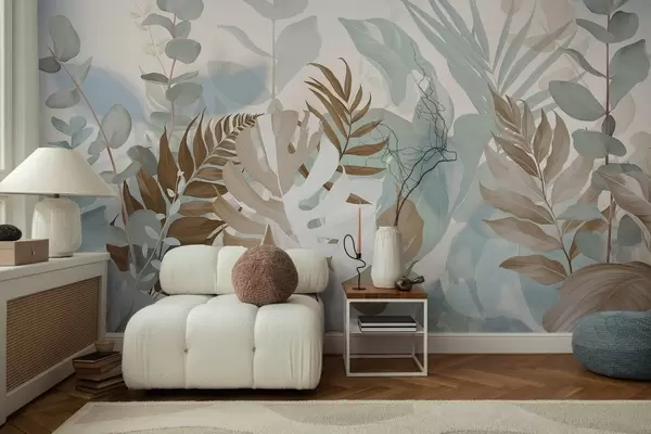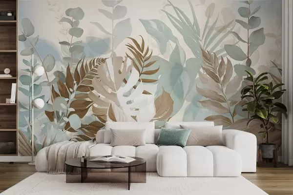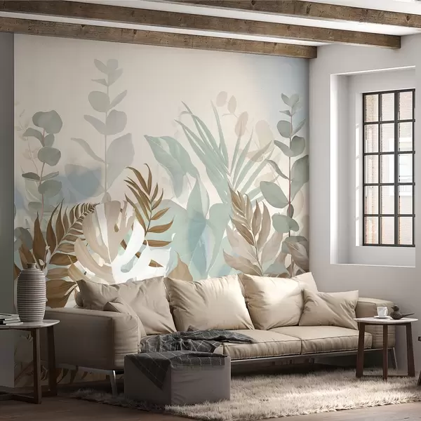 Stenske poslikave Pastelne rastline praproti, monstera in evkaliptus, svetlo teksturirano ozadje, mehka osvetlitev, mirno , botanična ilustracija Št. w09316v1