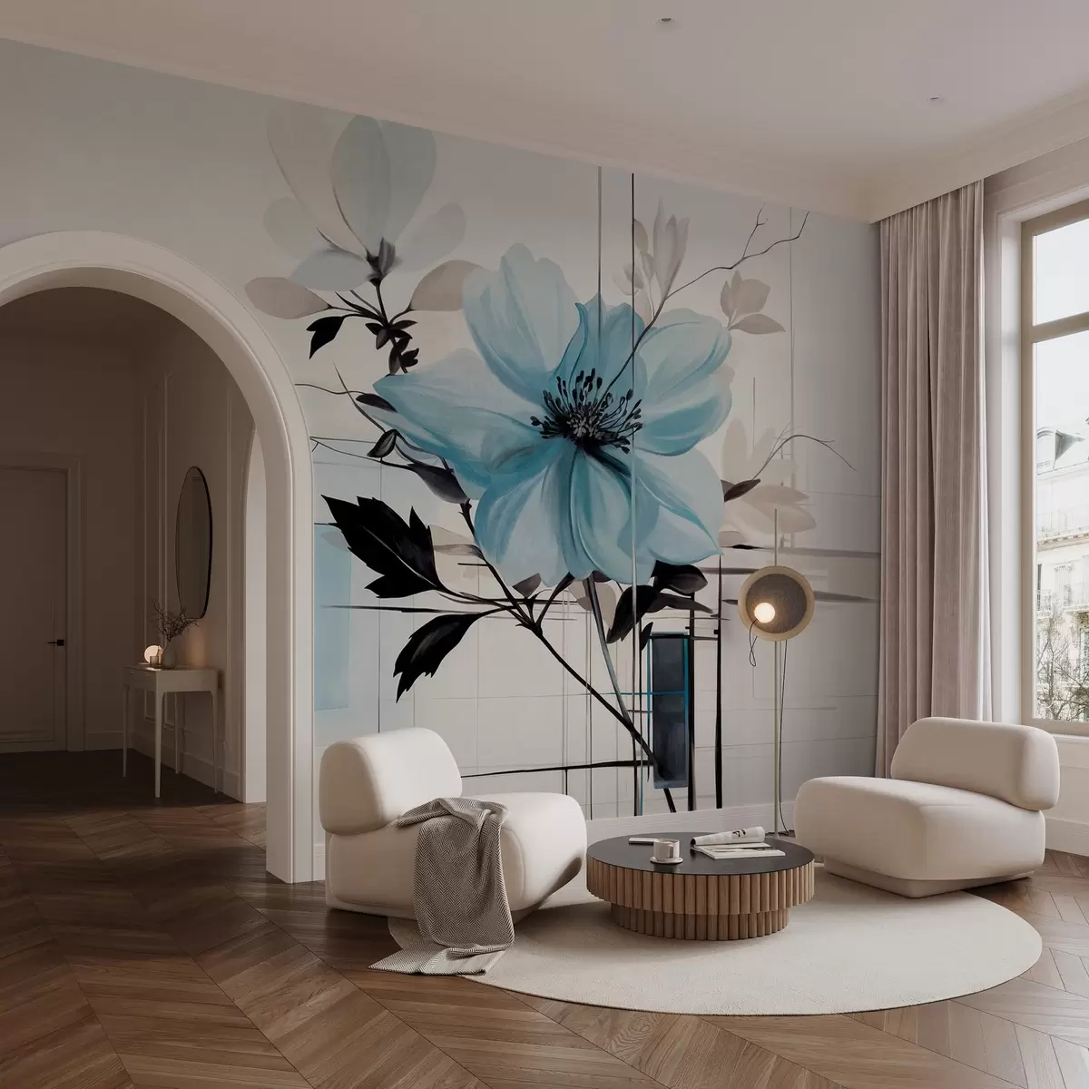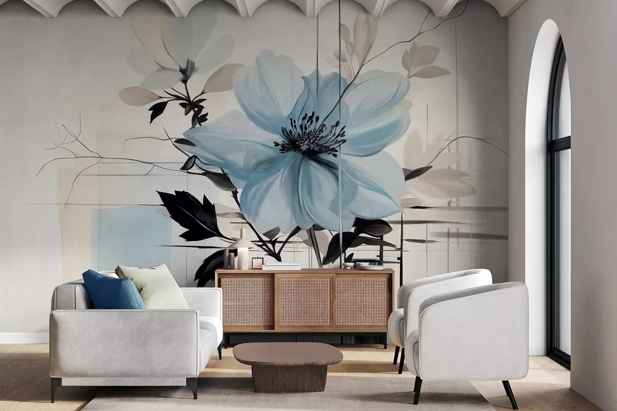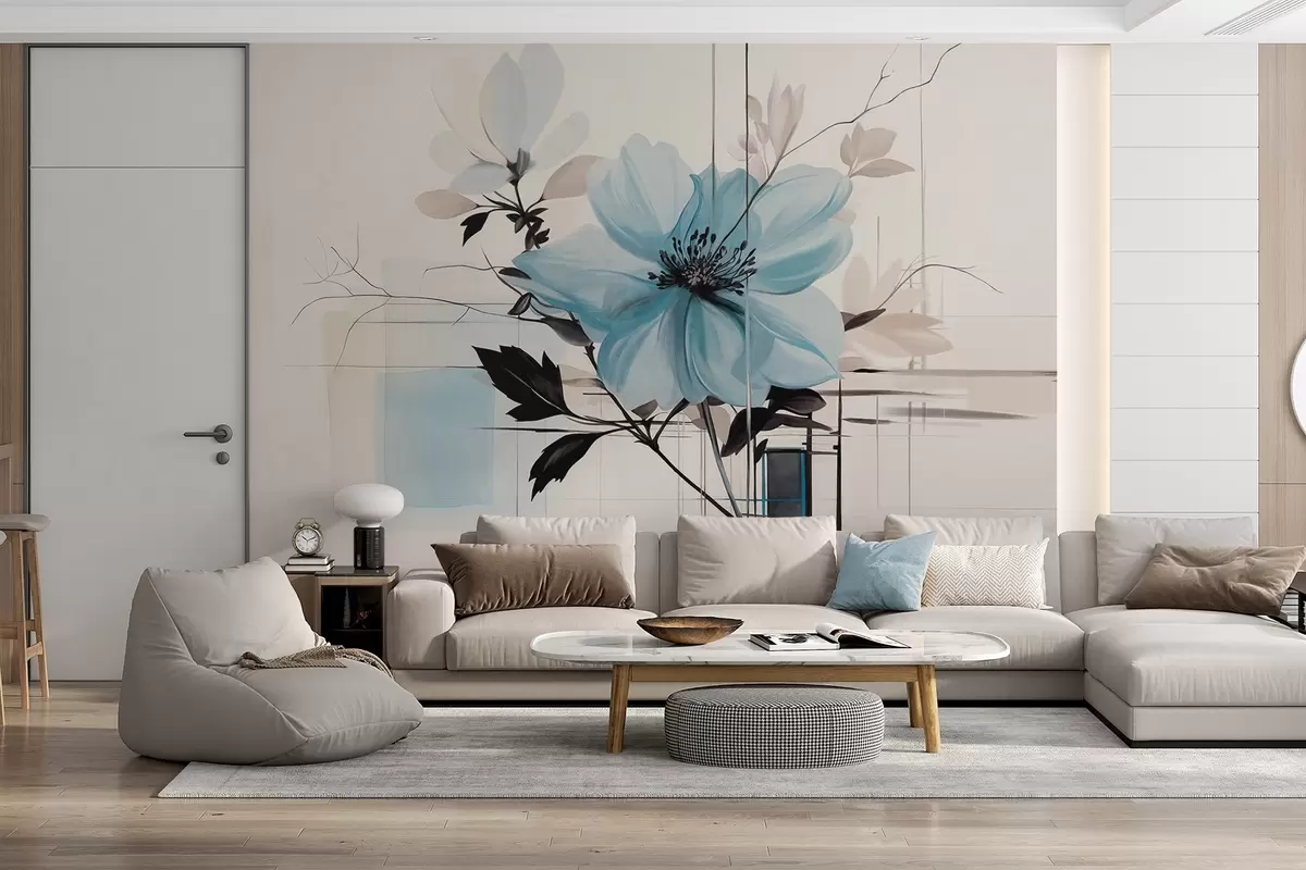 Stenske poslikave Abstraktna teksturirana modra roža s temnimi listi in vejami, geometrijskimi minimalističnimi oblikami in linijami v umirjenih barvah Št. w09332