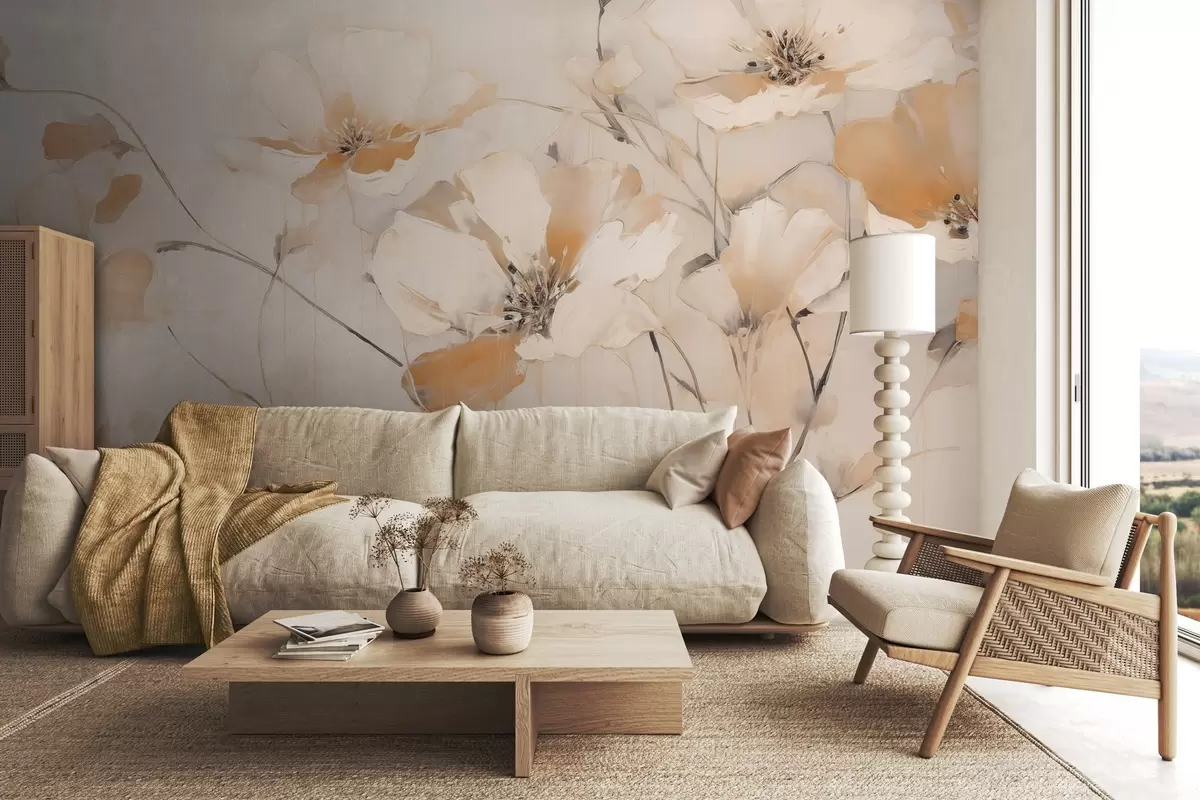Stenske poslikave Bele in oranžne teksturirane rože z dolgimi stebli, svetlo ozadje, mehke barve, elegantna sestava, nežne poteze čopiča Št. w09335