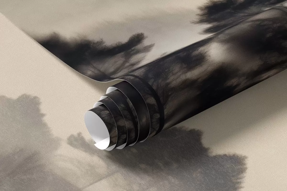 Stenske poslikave Teksturirana gorska pokrajina s plastmi megle, silhueta dreves v ospredju, oddaljeno gorovje, mehka osvetlitev Št. w09338