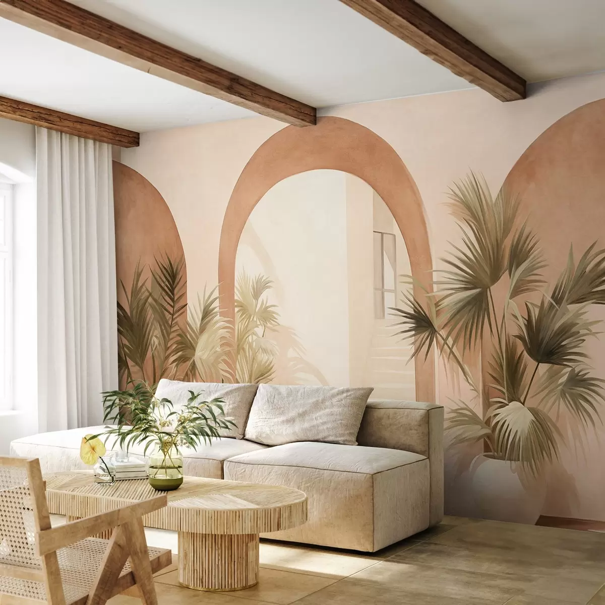 Stenske poslikave Teksturirani loki z rastlinami v lončkih, svetlo bež barvna paleta, minimalistična zasnova, stopnišče v ozadju Št. w09339