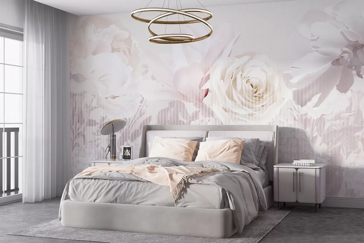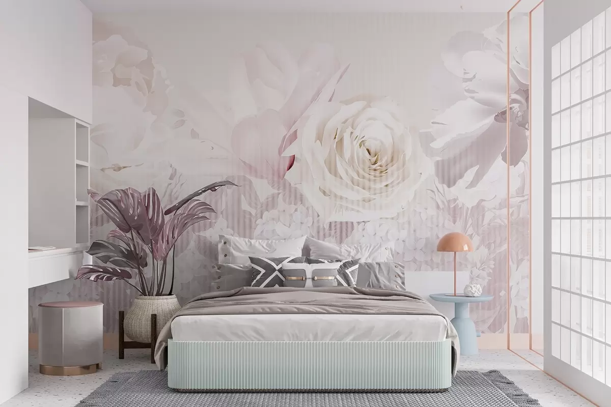 Stenske poslikave Cvetlični aranžma z vrtnicami, hortenzijami in tulipani v nežnih pastelnih odtenkih bele, rožnate in bež barve s črtasto teksturo Št. w09340