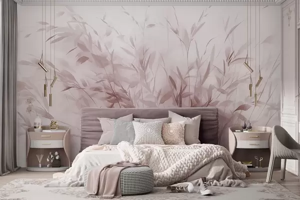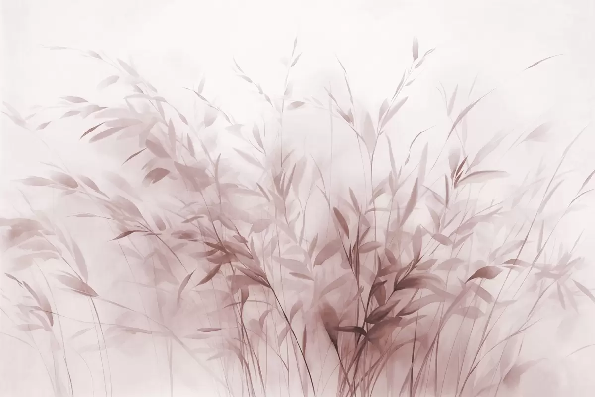 Stenske poslikave Trava in plevel s tankimi listi in stebli, svetlo rožnate barve, mehke in nežne poteze čopiča, minimalistični tisk Št. w09342v2