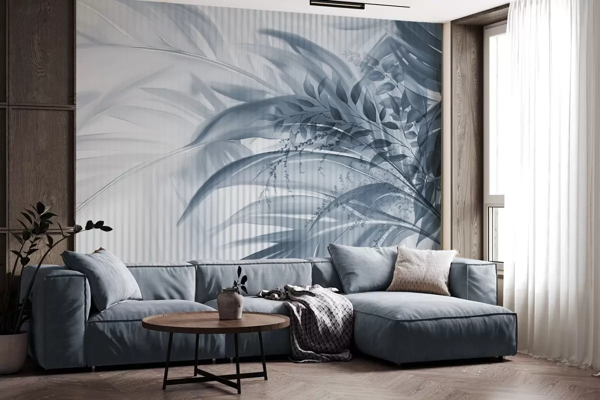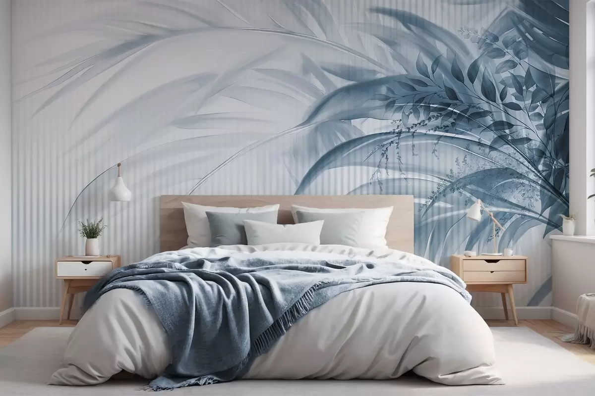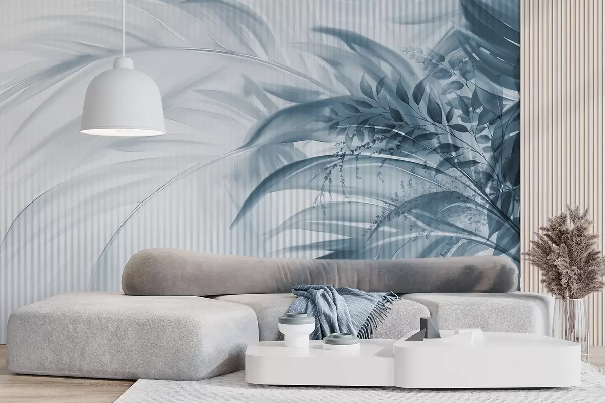 Stenske poslikave Palmovi tropski modri listi z belim črtastim ozadjem, mehka osvetlitev, nežne poteze čopiča, organske oblike Št. w09343v1