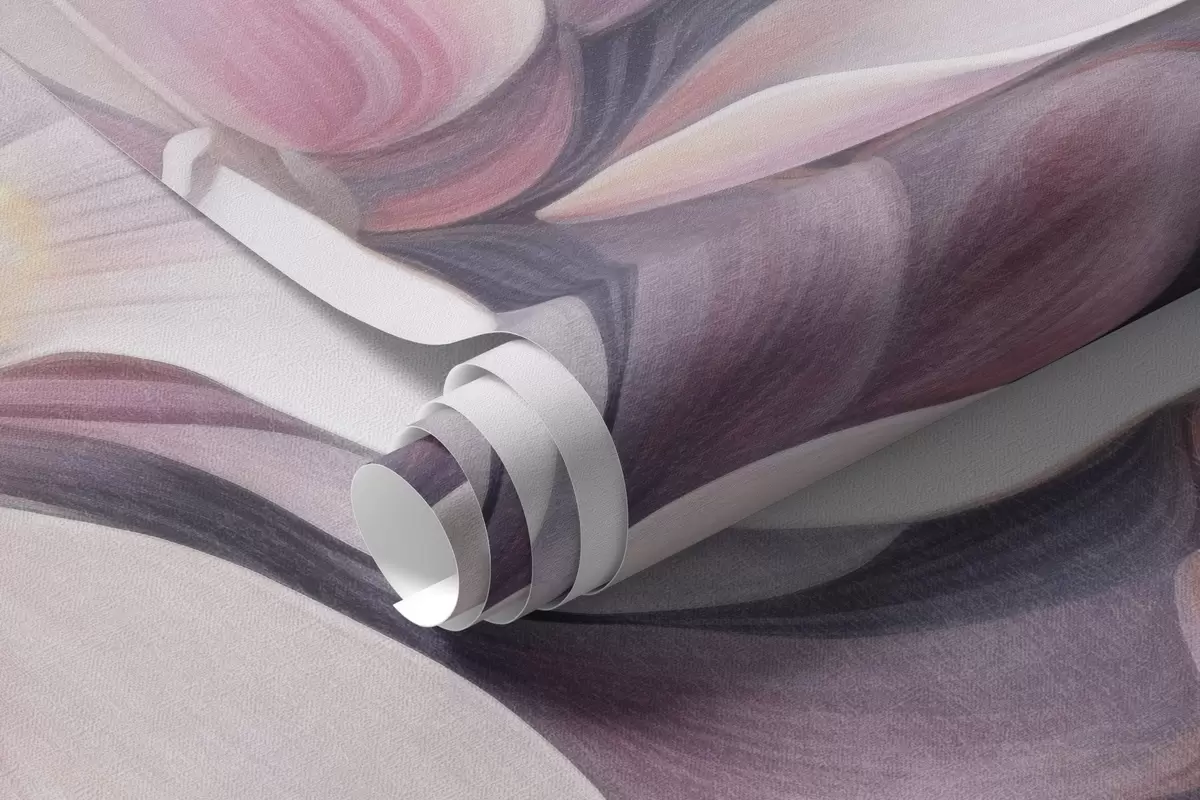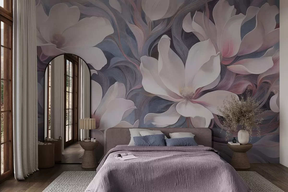 Stenske poslikave Teksturirana slika belih cvetov magnolije z rožnatimi poudarki na ozadju vrtinčastih, utišanih modrih in sivih tonov Št. w09344
