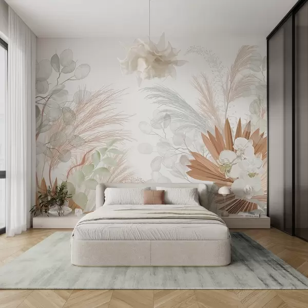 Stenske poslikave Pampas trava, evkaliptus, tropska listja in orhideje na belem ozadju, pastelne barve Št. w09366