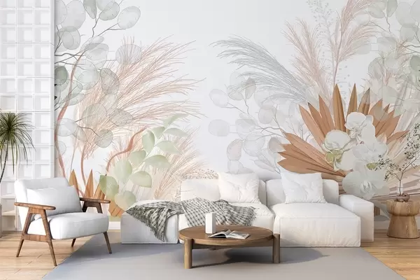 Stenske poslikave Pampas trava, evkaliptus, tropska listja in orhideje na belem ozadju, pastelne barve Št. w09366