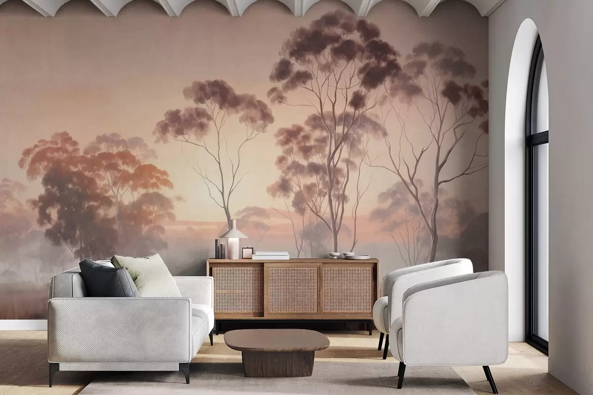 Stenske poslikave Pokrajina z evkaliptusovimi drevesi na polju s pastelno rožnatim in oranžnim nebom, rahlo meglico, slikarstvo v teksturiranem slogu Št. w09367