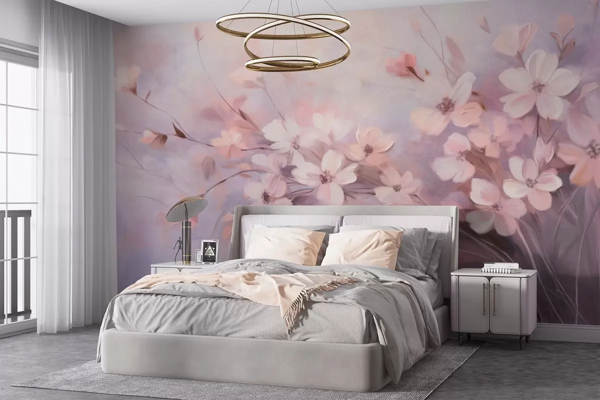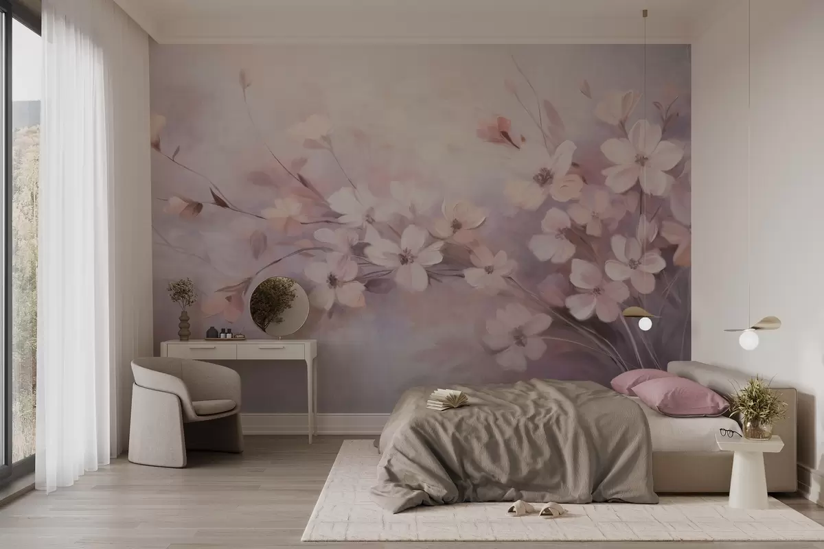 Stenske poslikave Cvetlični aranžma z nežnimi cvetovi z mehkimi, zabrisanimi robovi na pastelnem ozadju sivke in svetlo rožnatih odtenkov Št. w09369