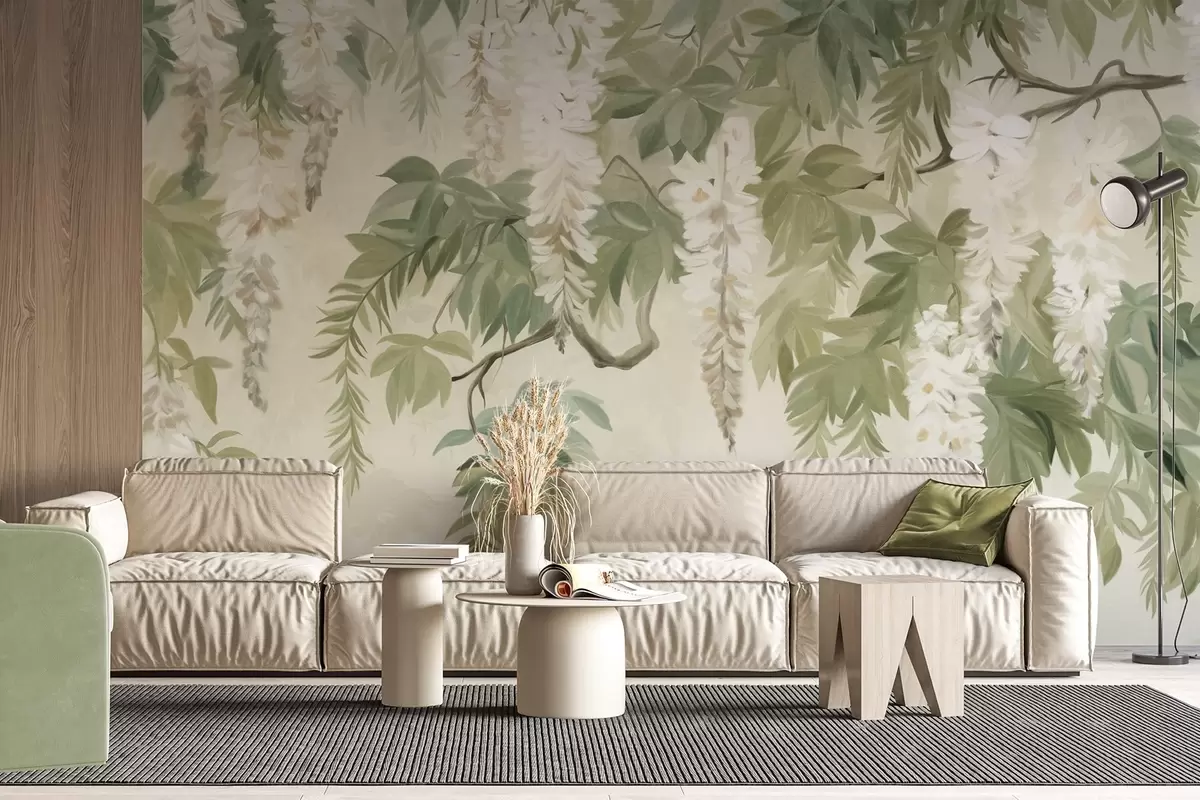 Stenske poslikave Veje glicinije z belimi cvetovi in zelenimi listi, zeleno ozadje, teksturirano vintage slikarstvo Št. w09375
