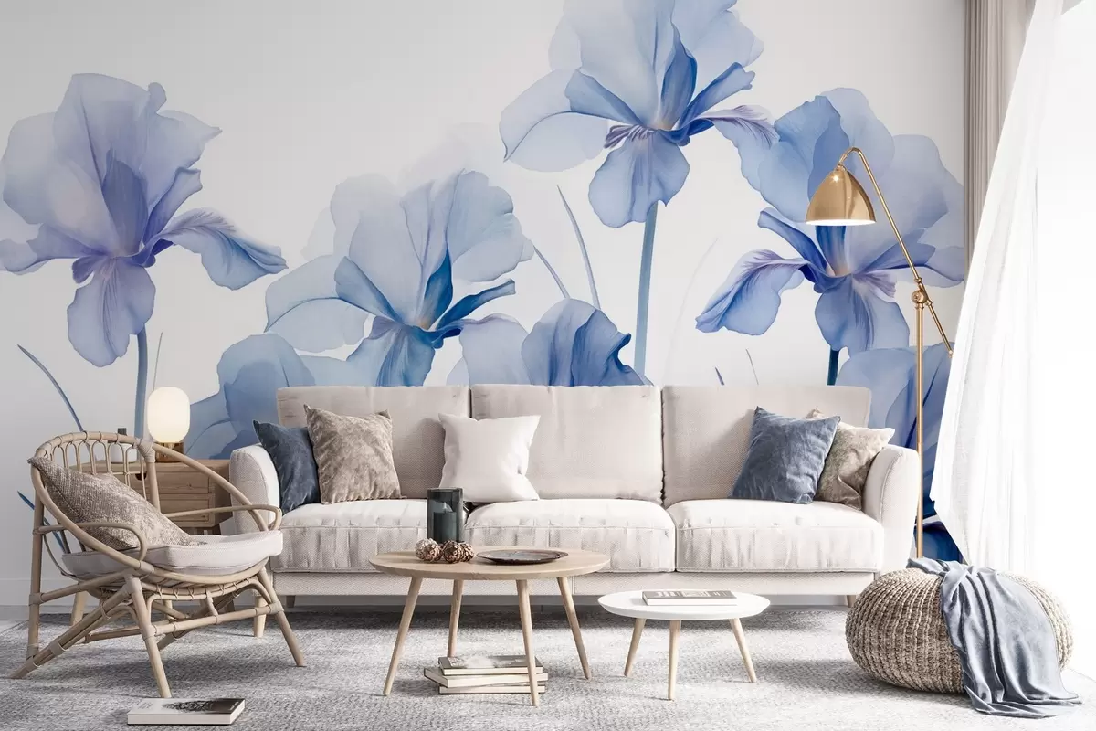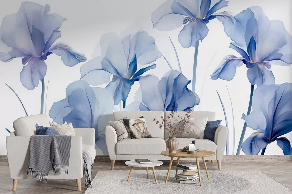 Stenske poslikave Modri cvetovi irisa s prosojnimi cvetnimi lističi in dolgimi stebli, razporejeni v vrsti na modrem ozadju, mehki in teksturirani Št. w09379