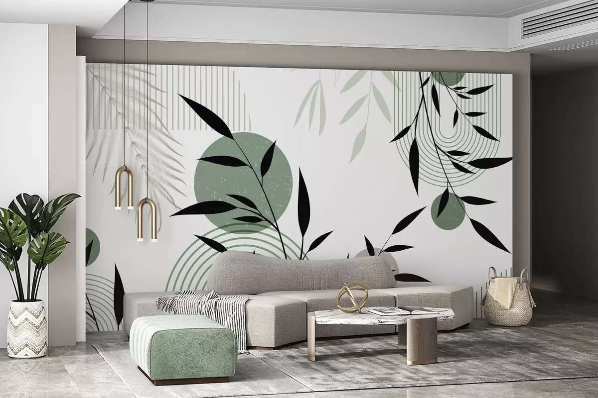 Stenske poslikave Teksturiran abstraktni tisk z geometrijskimi oblikami, krogi in loki ter črnimi in zelenimi rastlinami na belem ozadju Št. w09384