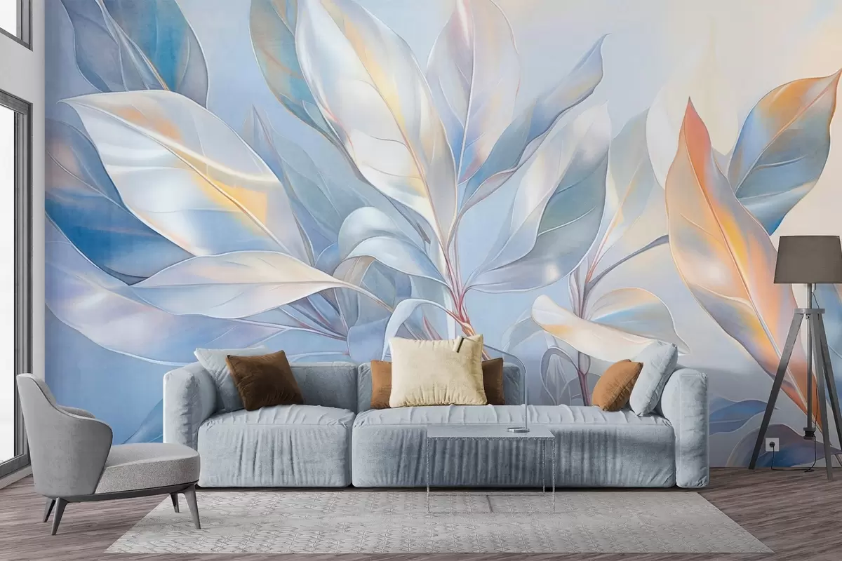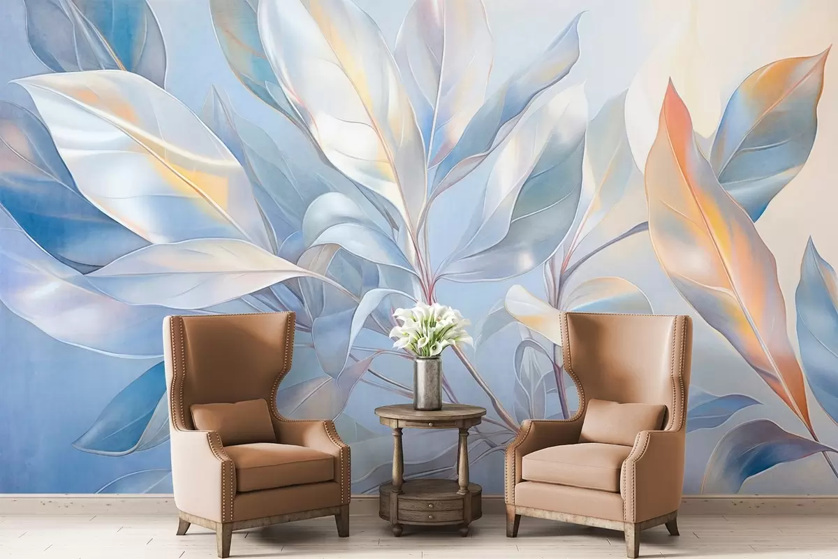 Stenske poslikave Listi magnolije z belimi in modrimi odtenki, mehka osvetlitev, elegantna kompozicija, podrobne listne žile, umetniške poteze čopiča Št. w09385