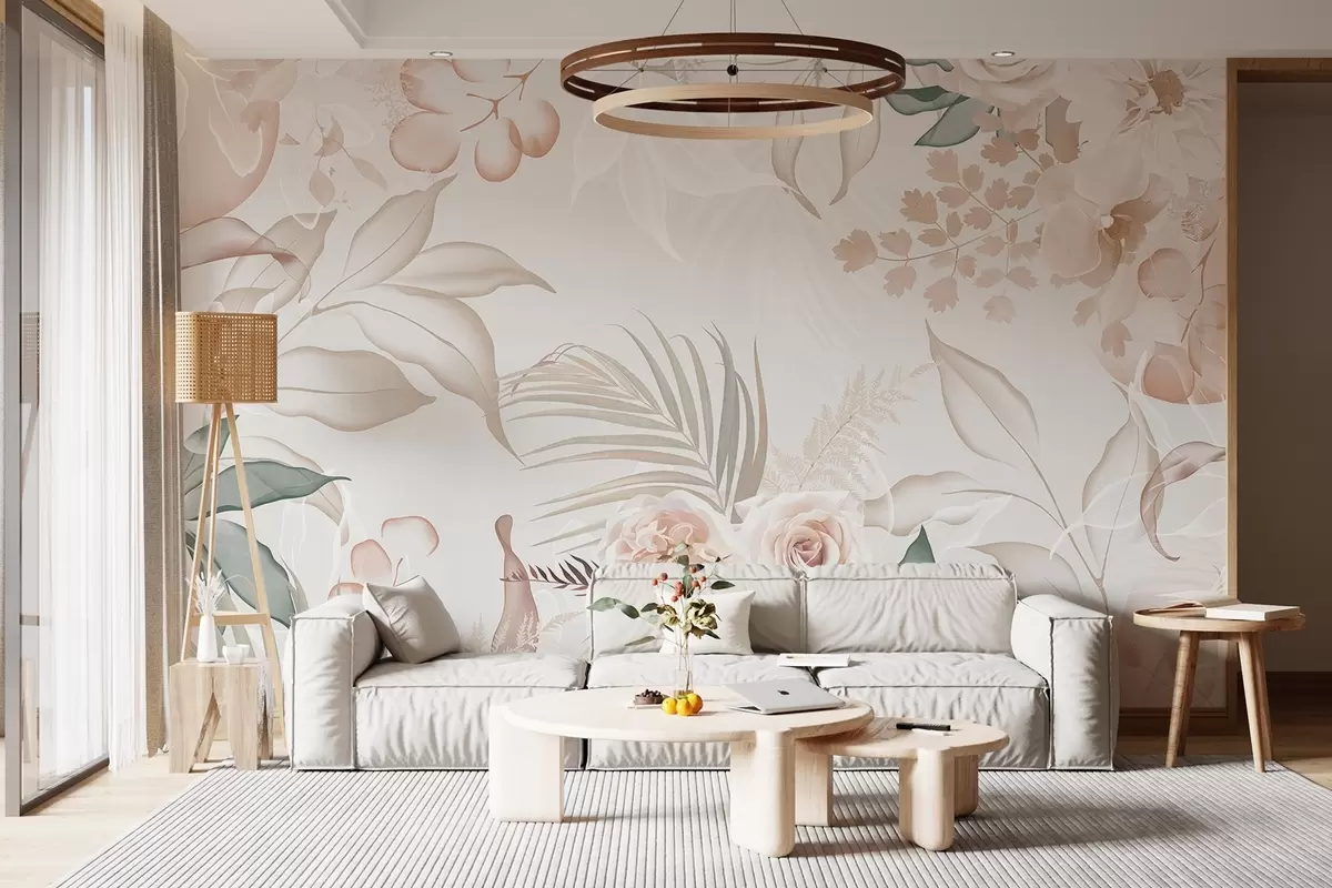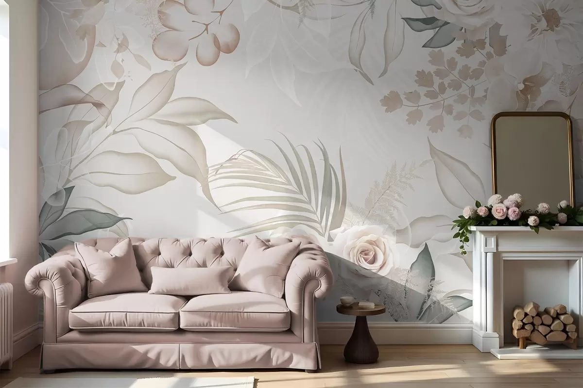 Stenske poslikave Cvetlični aranžma s teksturo iz vrtnic, orhidej, evkaliptusa in palmovih listov v pastelnih barvah, bež ozadje Št. w09393