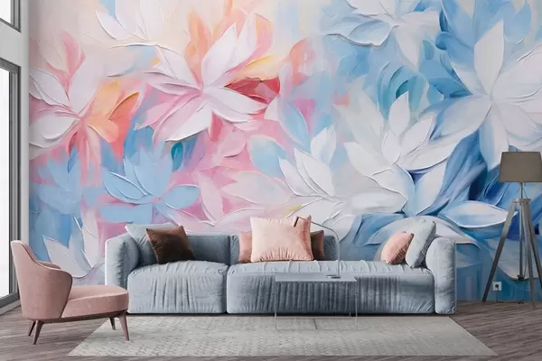 Stenske poslikave Bele cvetlice z rožnatimi in modrimi listi, oljna slika v abstraktnem slogu, mehki čopični potegi, pastelne barve Št. w09396