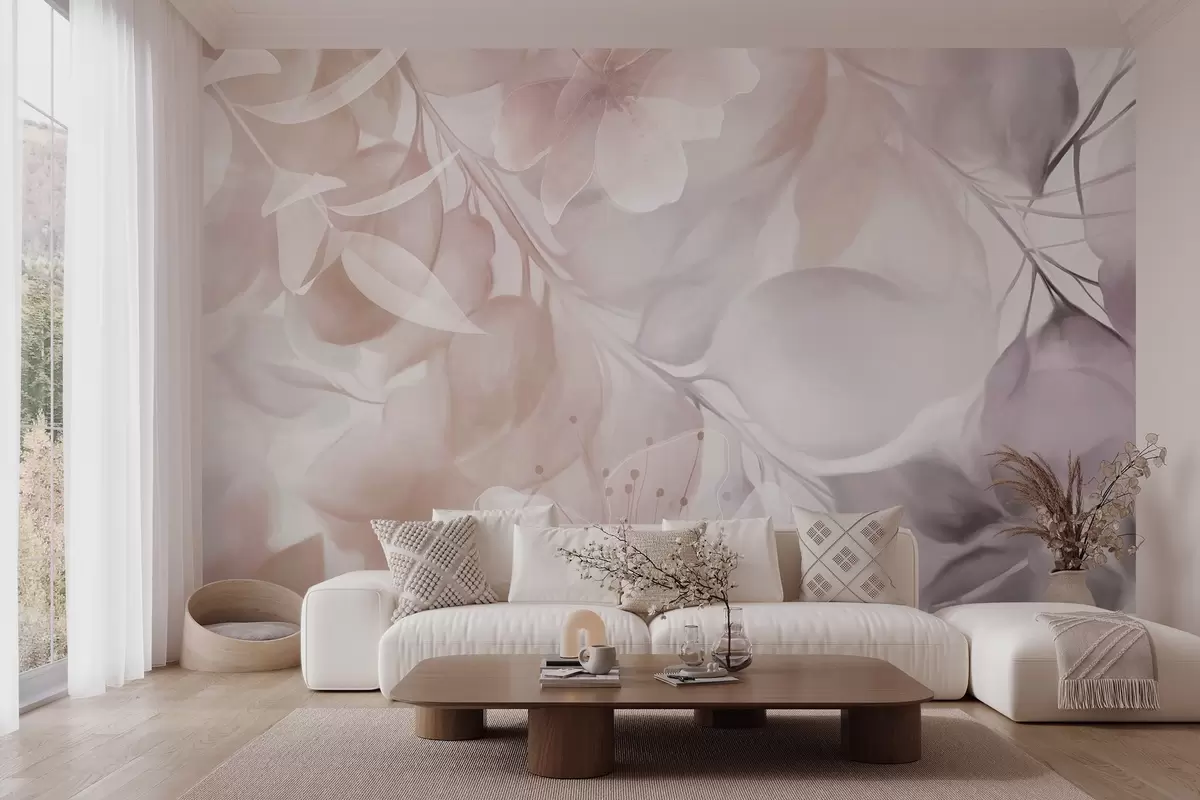 Stenske poslikave Cvetlična umetnost z nežnimi bež in rjavimi cvetovi, listi in vejami, mehkimi pastelnimi barvami in akvarelnim teksturiranim učinkom Št. w09397