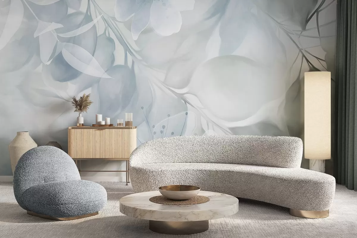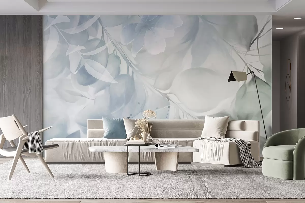 Stenske poslikave Cvetlična umetnost z nežnimi modrimi in zelenimi cvetovi, listi in vejami, mehkimi pastelnimi barvami in akvarelnim teksturiranim učinkom Št. w09397v1
