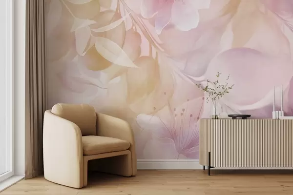 Stenske poslikave Cvetlična umetnost z nežnimi rumenimi in vijoličnimi cvetovi, listi in vejami, mehkimi pastelnimi barvami, akvarelnim teksturiranim učinkom Št. w09397v2