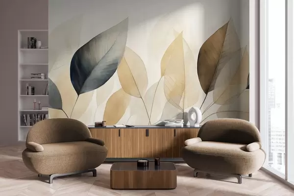 Stenske poslikave Teksturirano slikanje, ki posnema liste v odtenkih rjave, rumene in sive barve, z nežnimi žilami in stebli Št. w09400