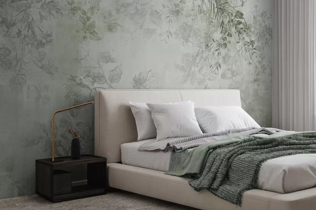 Stenske poslikave Vintage teksturirana cvetlična umetnost z risanimi ilustracijami nežnih vrtnih cvetov in listov, v nežnih zelenih odtenkih Št. w09402v2