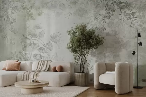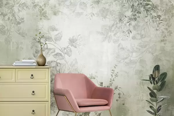 Stenske poslikave Vintage teksturirana cvetlična umetnost z risanimi ilustracijami nežnih vrtnih cvetov in listov, v nežnih zelenih odtenkih Št. w09402v2