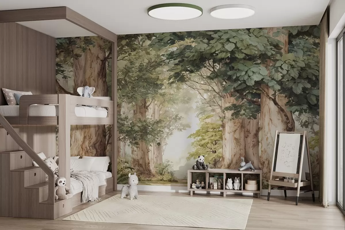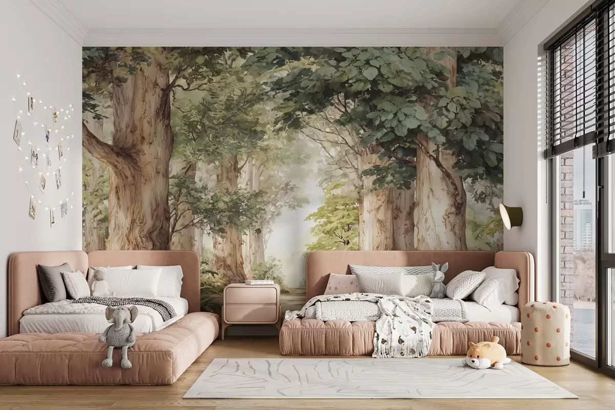 Stenske poslikave Gozdna pot med mogočnimi drevesi v akvarelnem slogu Št. w09404