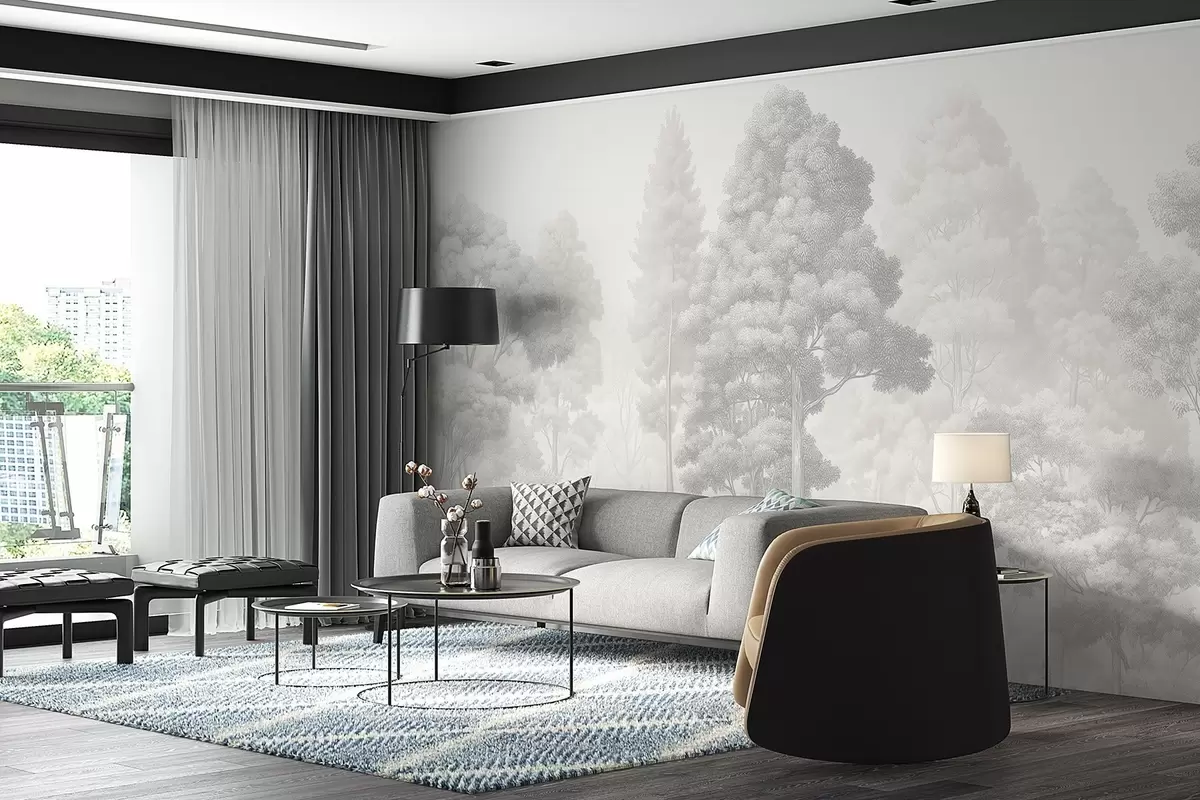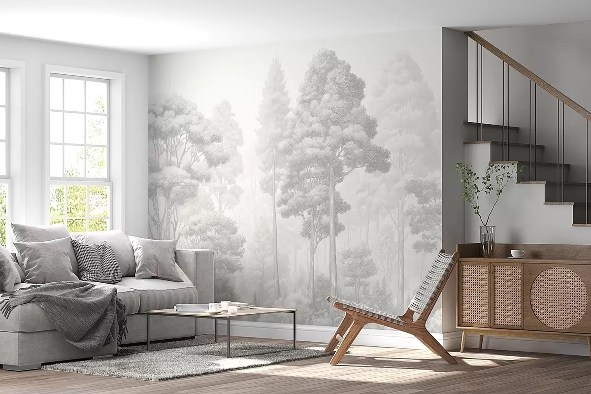 Stenske poslikave Umetniška gozdna pokrajina v tehniki črno-bele grafične šrafure Št. w09411