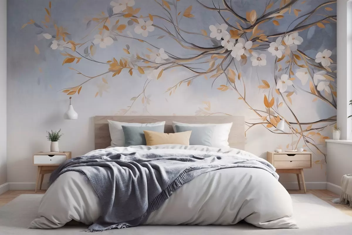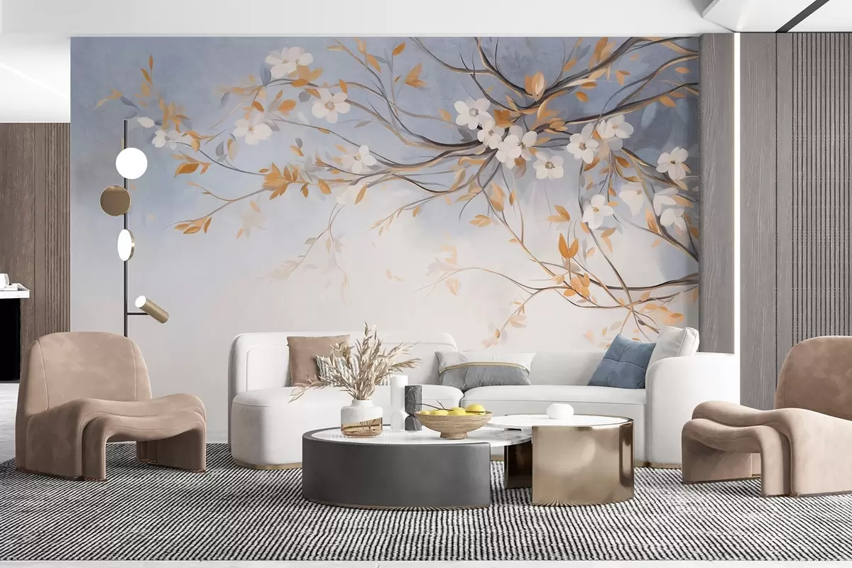 Stenske poslikave Bele cvetove z oranžnimi listi na veji drevesa, svetlo modro teksturirano ozadje, nežni čopiči Št. w09415