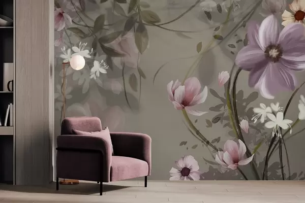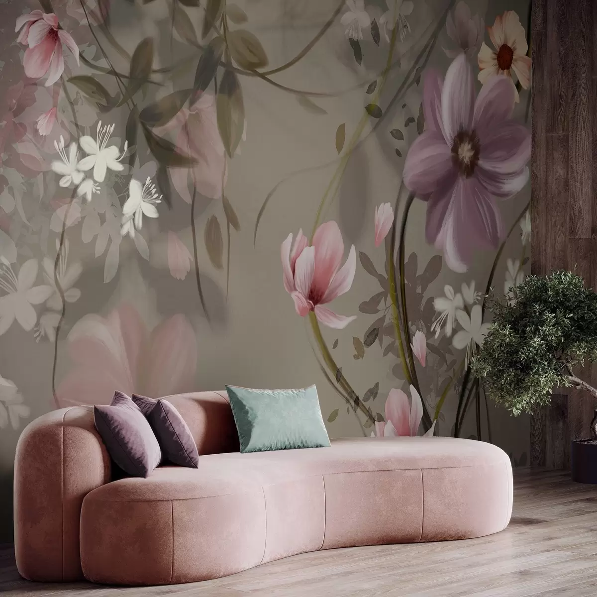 Stenske poslikave Rožnate in bele cvetlice z rjavimi stebli in listi, mehka osvetlitev, pridušene barve, cvetlični aranžma Št. w09417