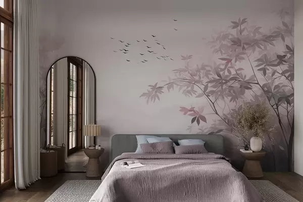 Stenske poslikave Teksturirana pokrajina z drevesi in jatami ptic, ki letijo po nebu, pastelne barve, prizor iz narave Št. w09418v1