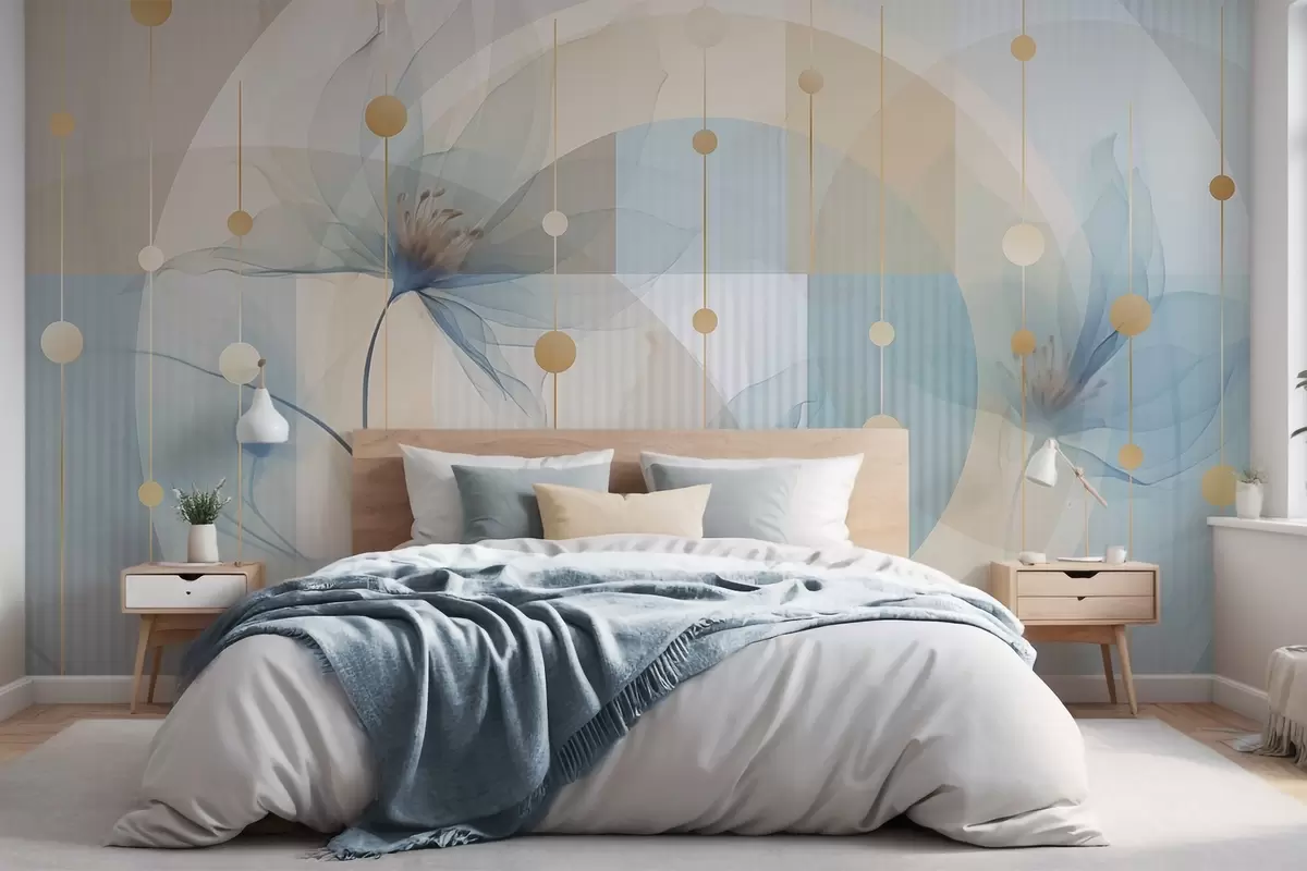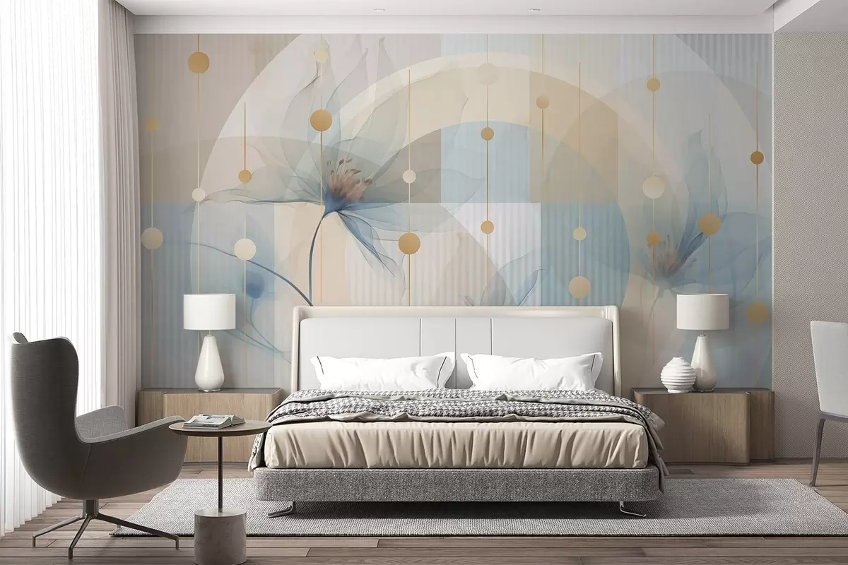 Stenske poslikave Abstraktni prosojni cvetovi, krogi in geometrijske oblike, pastelno modra, bež in bela barvna paleta Št. w09419