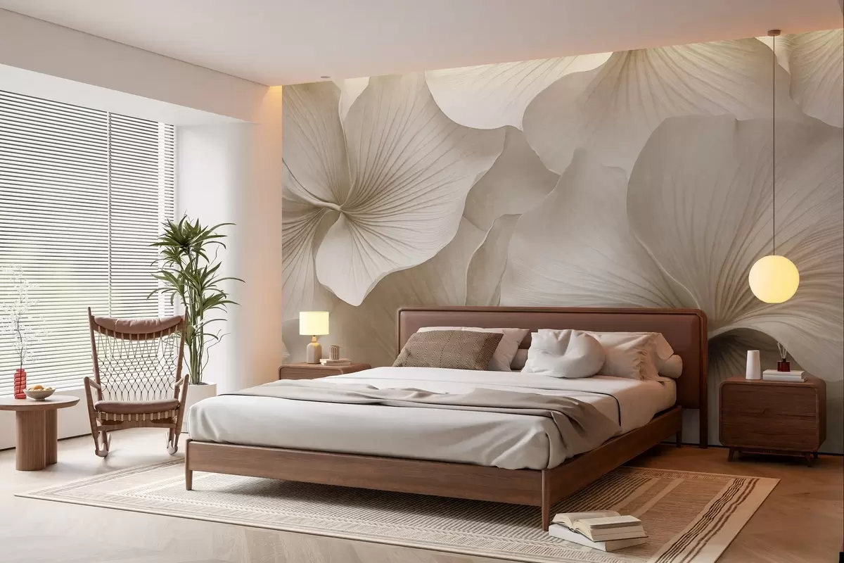 Stenske poslikave Bele in bež listi gingka, mehka tekstura, abstraktno cvetlični ozadje, minimalističen sodoben slog Št. w09421v1
