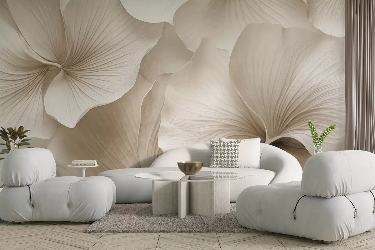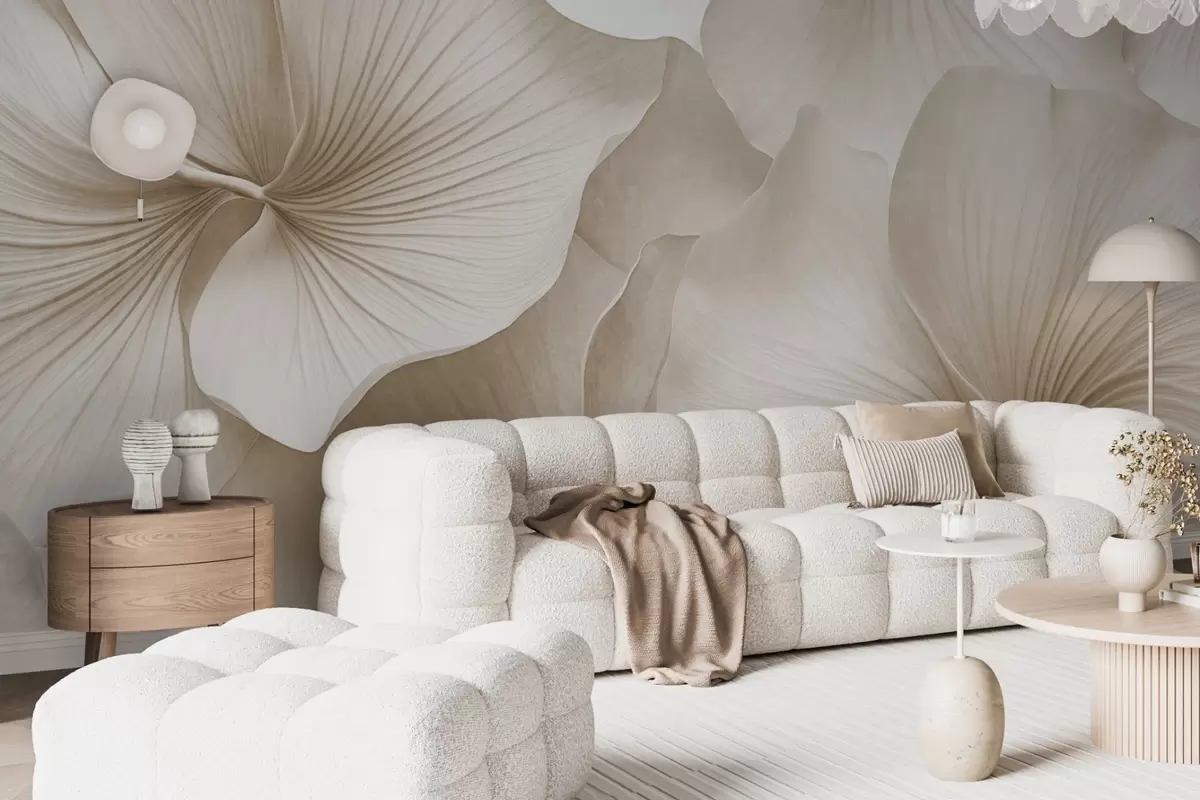 Stenske poslikave Bele in bež listi gingka, mehka tekstura, abstraktno cvetlični ozadje, minimalističen sodoben slog Št. w09421v1