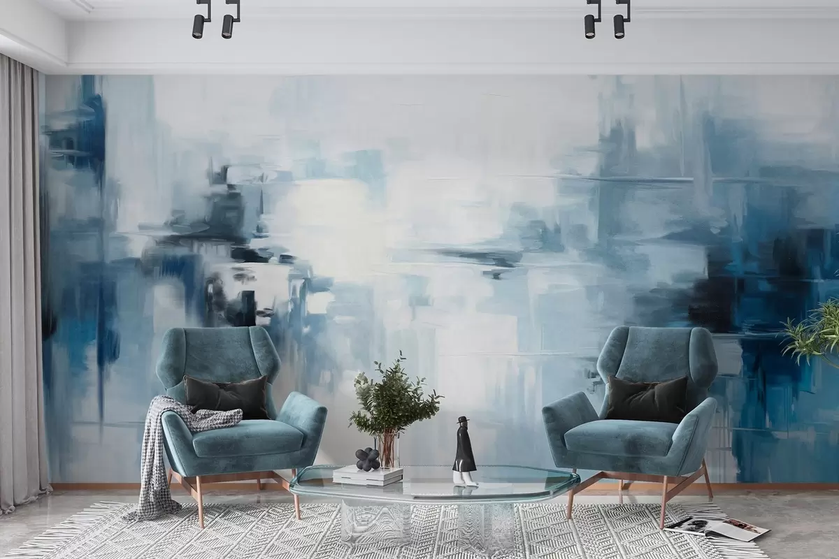 Stenske poslikave Abstraktna teksturirana imitacija krajinske slike z modrimi in belimi čopičnimi potezami, sodoben slog Št. w09422