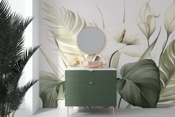 Stenske poslikave Bele kalije in zelene tropske liste, botanična ilustracija, svetlo ozadje, vintage stil, teksturirano Št. w09423