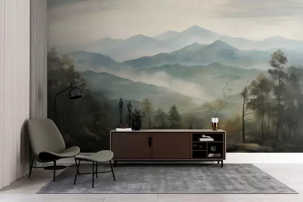 Stenske poslikave Megleno gorovje z drevesi, megla, oblačno nebo, pridušene barve, slog krajinske slike Št. w09424